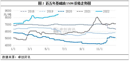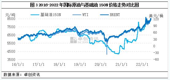二季度以来,国际原油在震荡走势中再度走高,期间虽所有回落,但整体仍然偏强运行。图3为2016-2022年国际原油与基础油150N价格走势对比,图中我们可以看到基础油的价格走势基本与原油走势保持一致,虽然部分时间段与原油走势的时间节点有所延迟,但整体符合原料与下游之间的价格传导规律。