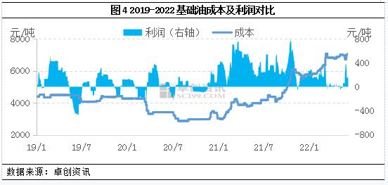 2022年以来,基础油的生产成本不断攀升,二季度基础油生产成本已达到近四年来的高水平,基础油的利润空间整体维持低位运转。据卓创资讯数据统计,2022年二季度,国内基础油平均利润水平整体在59.19元/吨,较第一季度相比下跌64.53%,较去年同期相比下跌85.33%,这里我们说的利润主要是以外采原料为主的生产厂家装置利润。因此原料成本的高位运行,为基础油价格筑牢底部支撑。